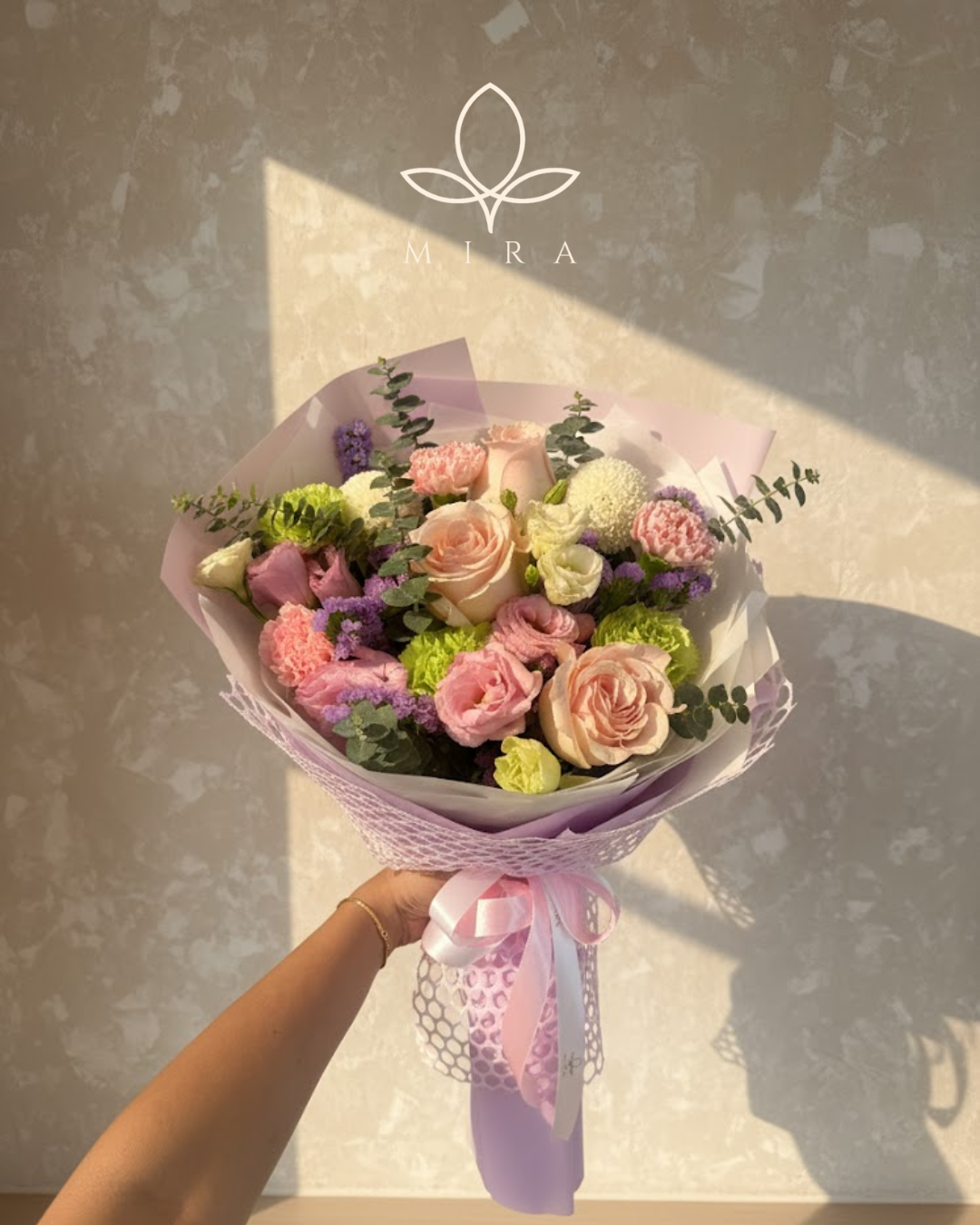 A gentle mix of blush roses and soft pastels that radiate warmth and grace — perfect for expressing affection and gratitude.