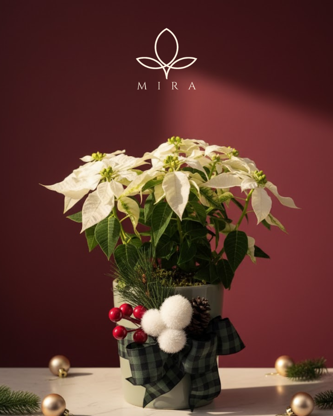 A festive touch of elegance — this white poinsettia arrangement radiates calm and sophistication. Adorned with a dark green plaid ribbon, frosted berries, and winter accents, it’s a perfect centerpiece for a cozy and refined holiday setting.