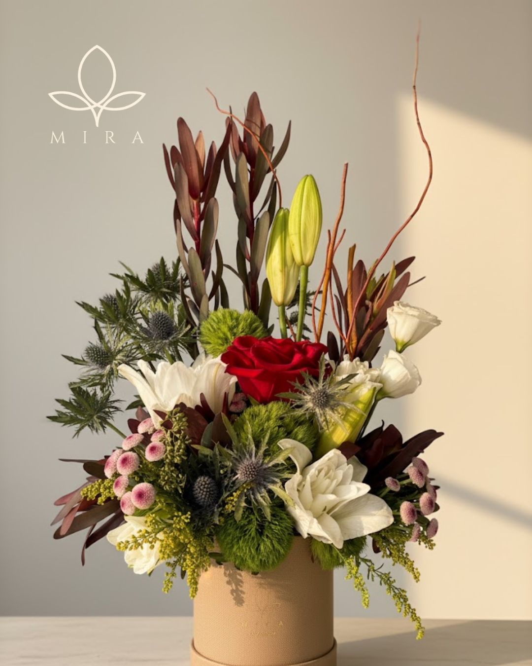 A stunning floral box that balances elegance and warmth — featuring a mix of lilies and roses complemented by rich greenery and textured accents. Perfect for adding sophistication to any space or gifting a touch of timeless beauty.