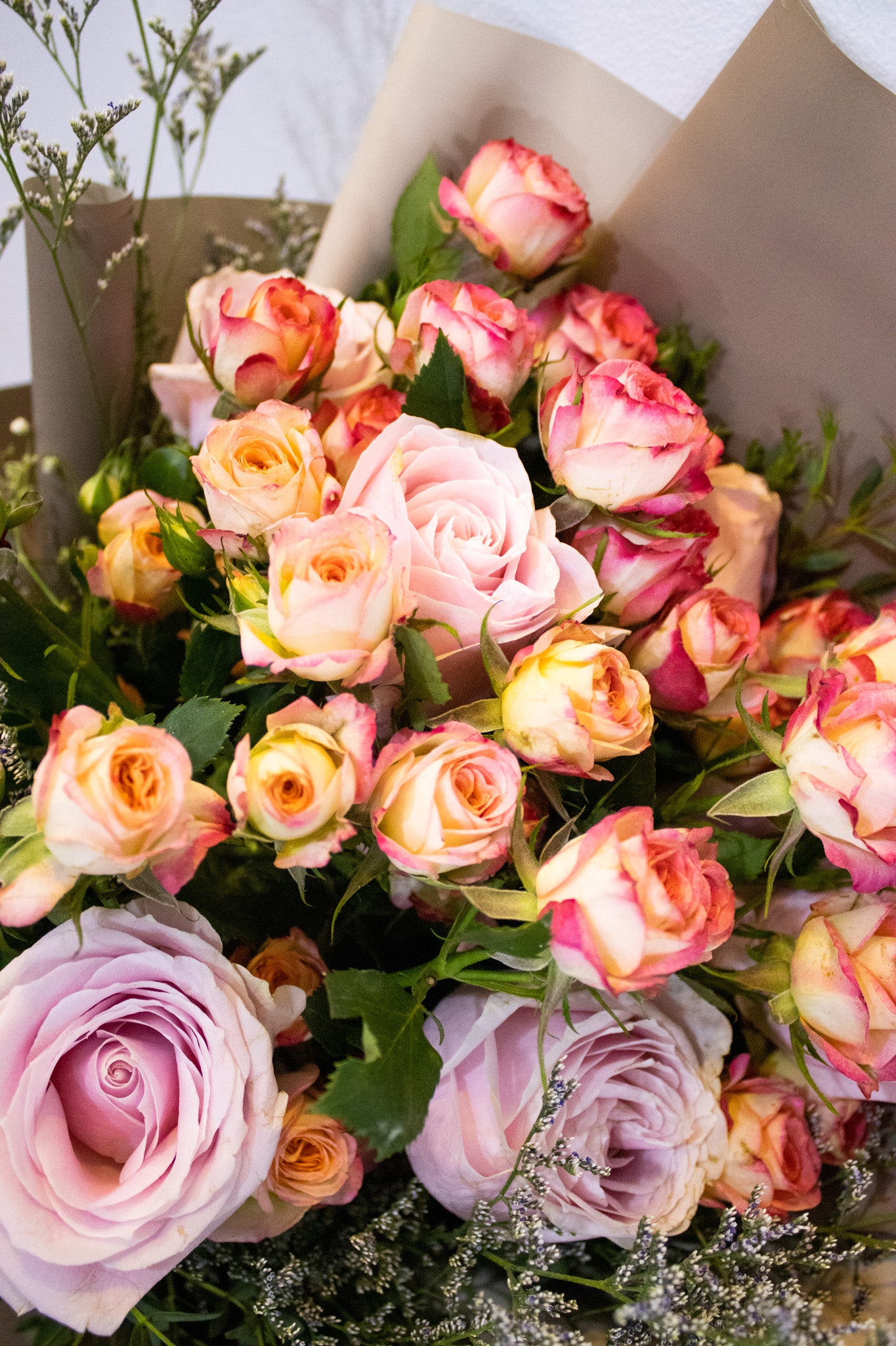 This bouquet is perfect for those who appreciate the beauty of a diverse range of roses. The colors and textures of the blooms complement each other perfectly, creating a striking and eye-catching arrangement. The premium greens add an extra touch of freshness and bring out the natural beauty of the 3 stem roses, spray roses and premium fillers.
