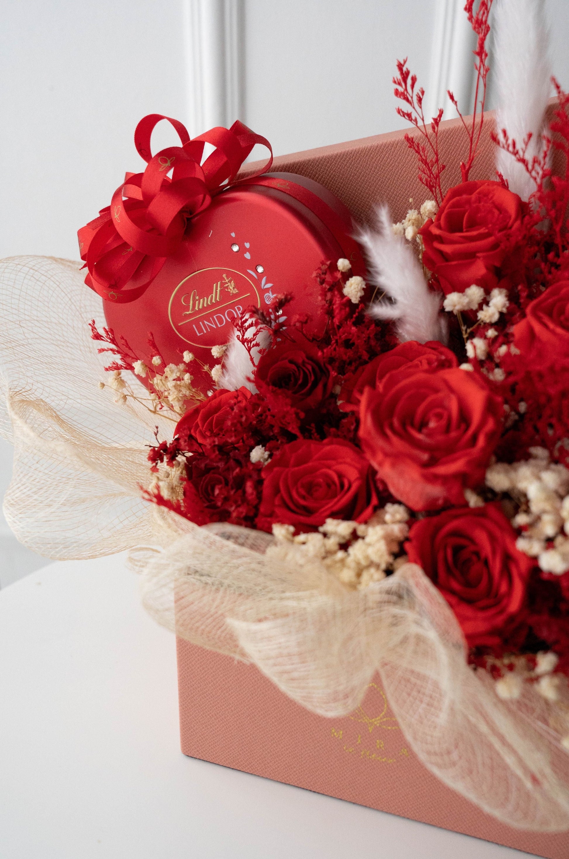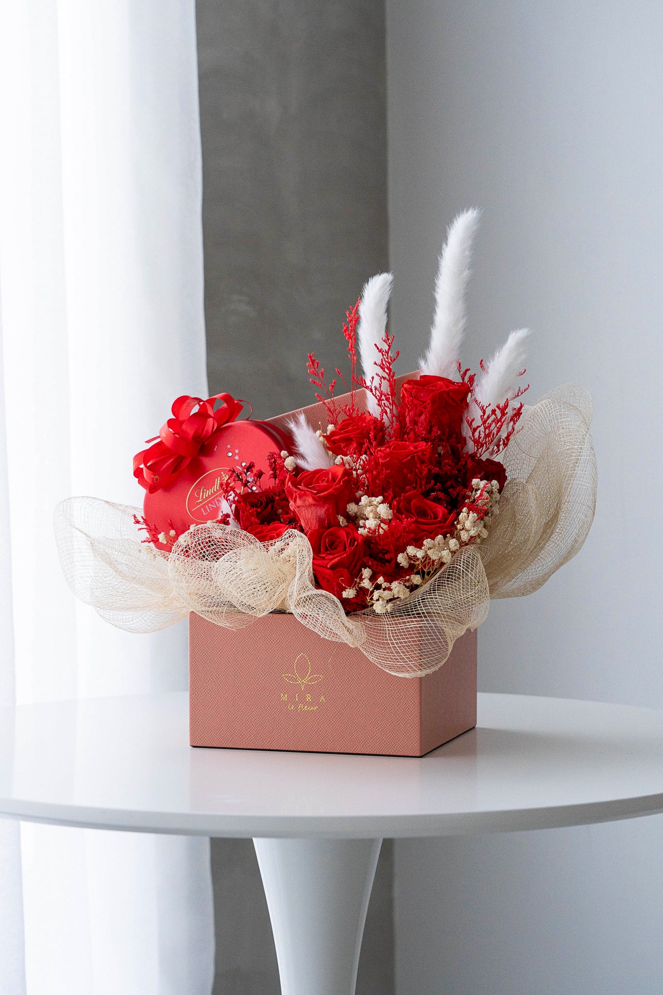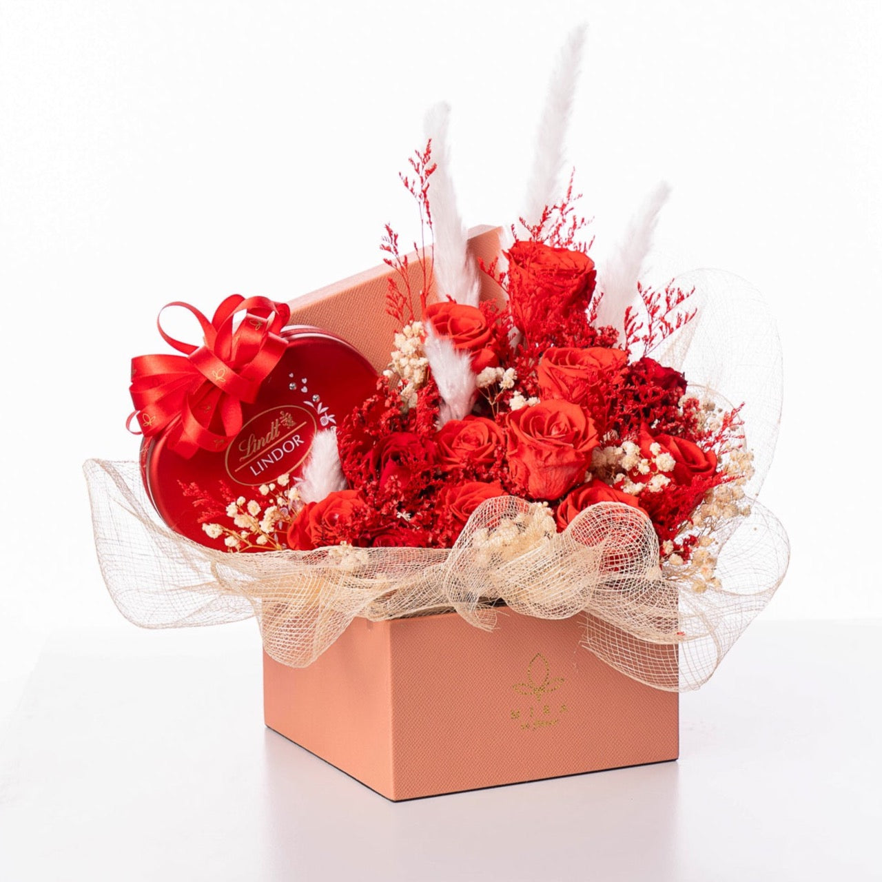 The allure of velvety red roses meets the indulgent sweetness of Lindt chocolate. Nestled in an elegant box, each scarlet rose whispers of timeless romance and desire.