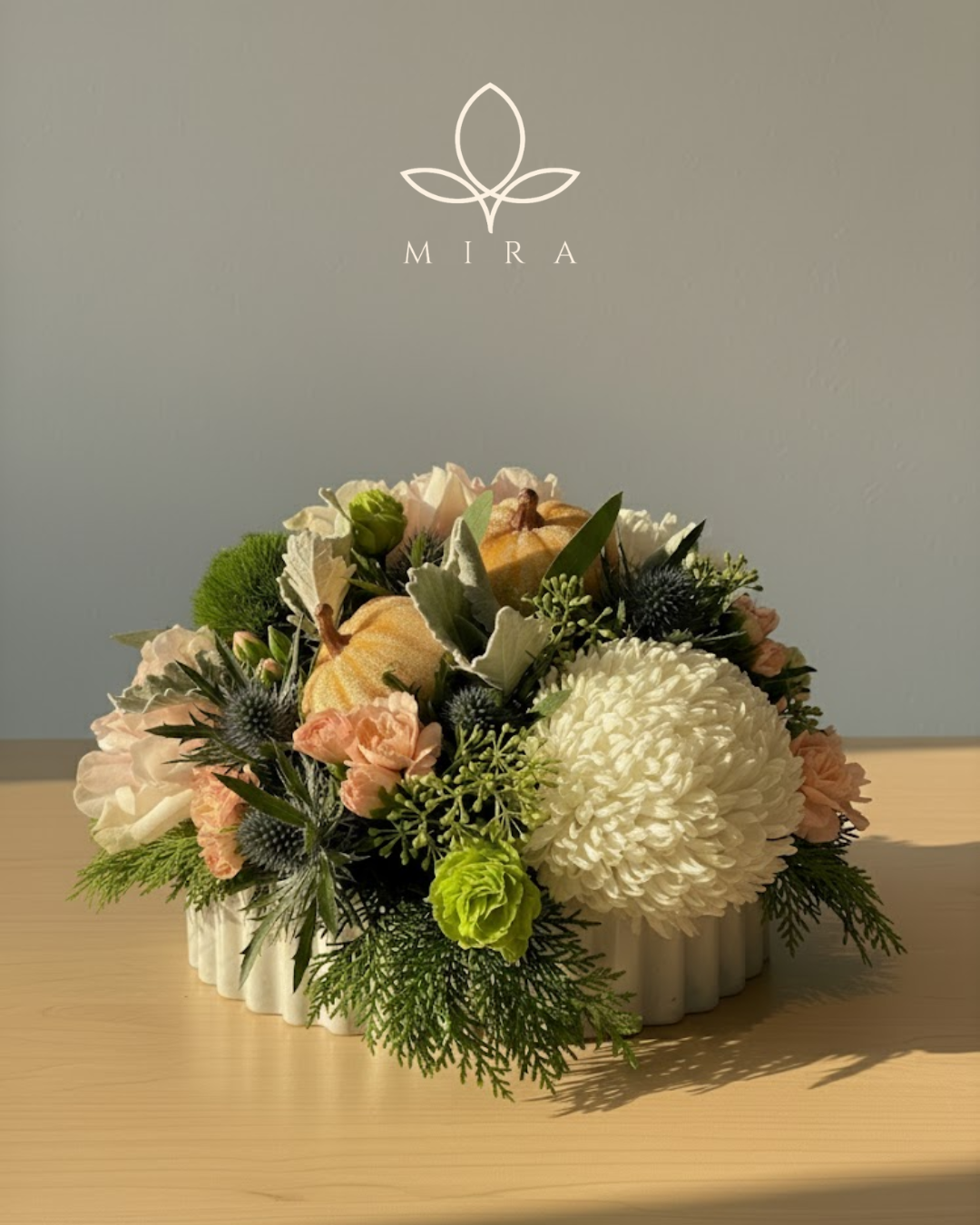 A warm and textured centerpiece that captures the charm of autumn. Featuring creamy chrysanthemums, soft peach blooms, and fresh greenery accented with miniature pumpkins — this arrangement brings a cozy, elegant touch to any space.