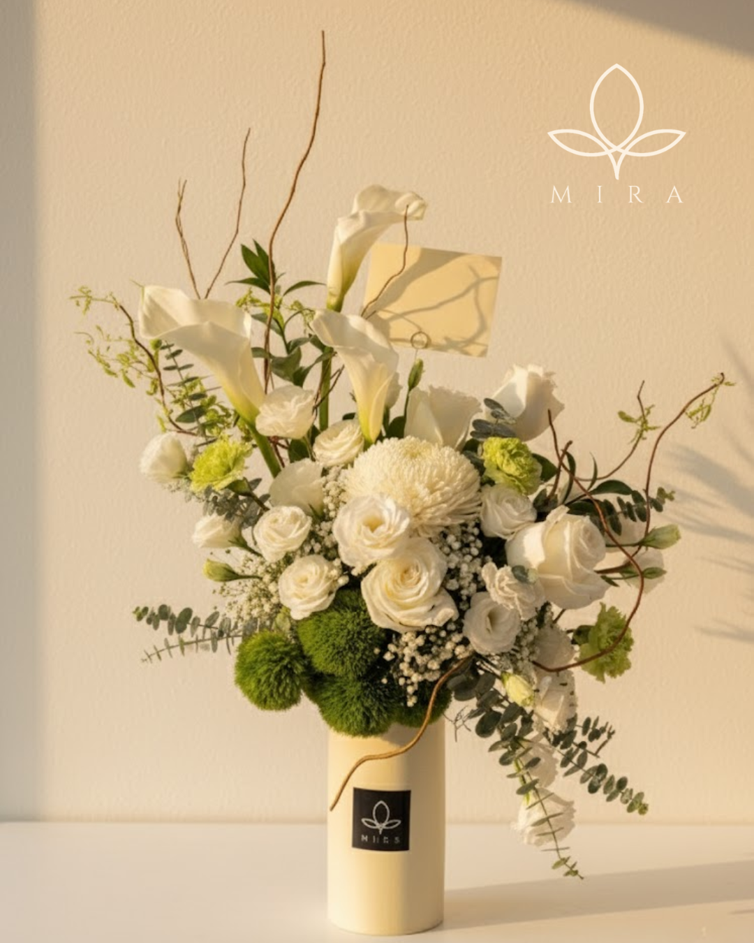 A timeless arrangement featuring elegant white lilies, chrysanthemums, and soft green accents — beautifully presented in a neutral vase. Its serene tones and graceful lines bring a touch of calm sophistication to any space.