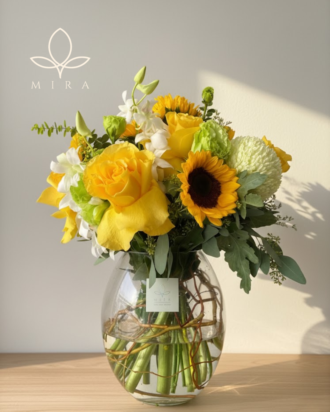 A bright and joyful mix of yellow roses and sunflowers, accented with orchids, chrysanthemums, and fresh greens. This cheerful arrangement brings warmth and sunshine to any space. 🌻💛