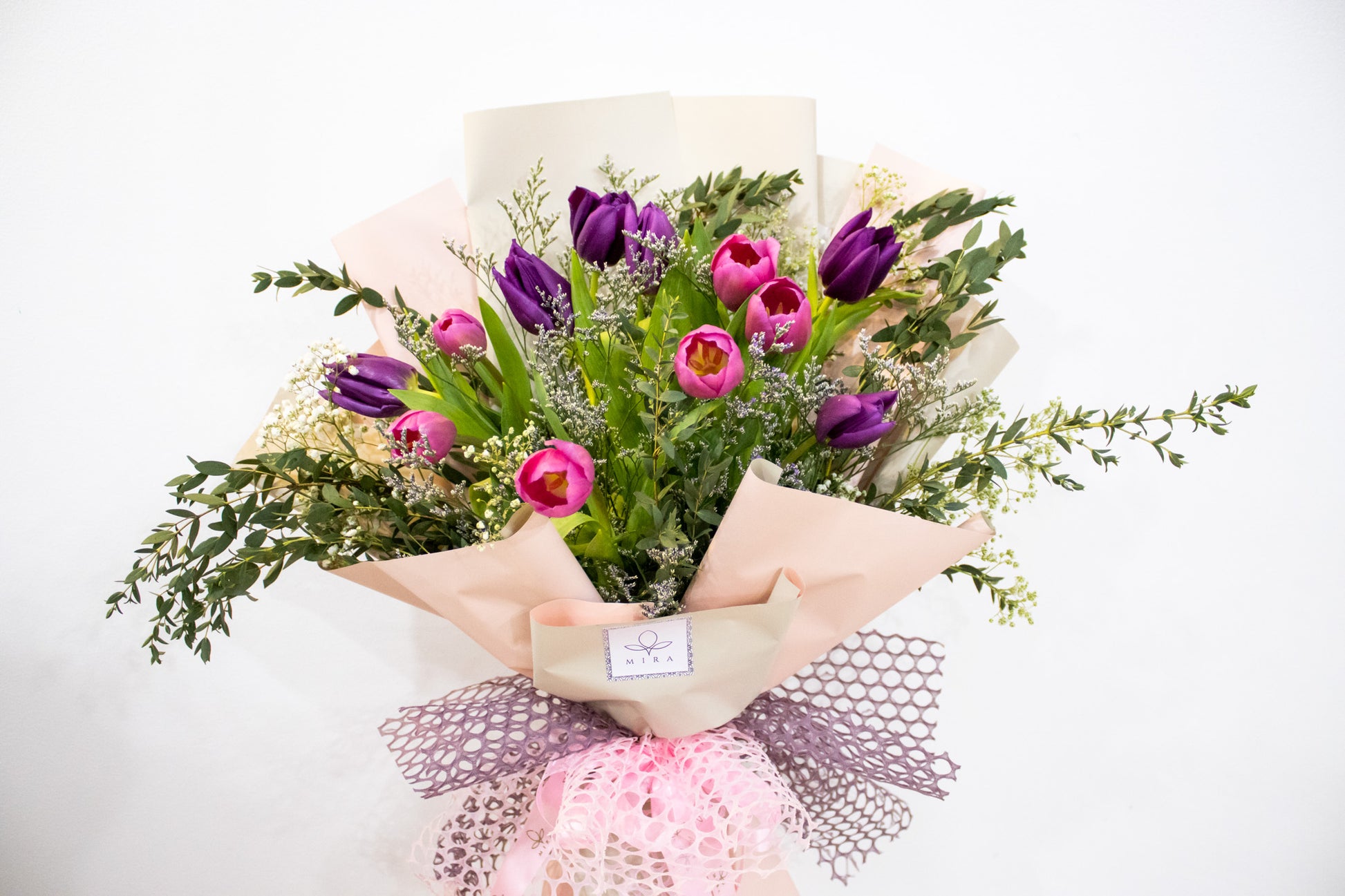 The “Tulip Temptation” bouquet is an enchanting mix of one dozen vibrant tulips in shades of pink and purple. The blooms are arranged in a classic bouquet style, with the stems artfully wrapped in a soft satin ribbon. The premium greens add a touch of freshness and complement the beauty of the tulips.