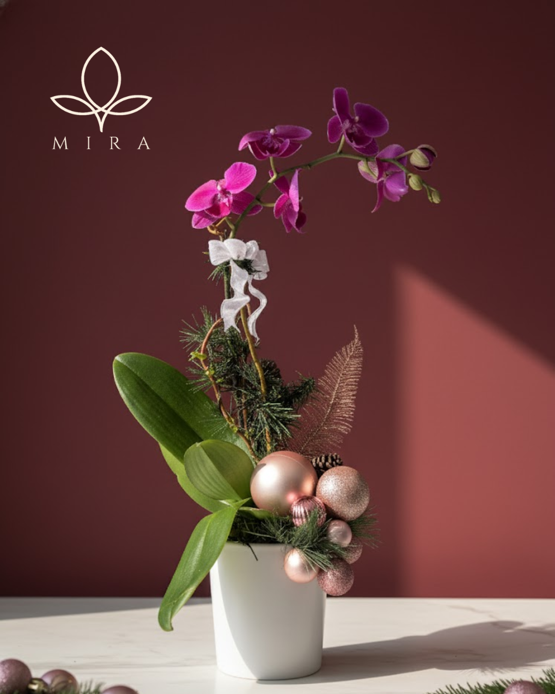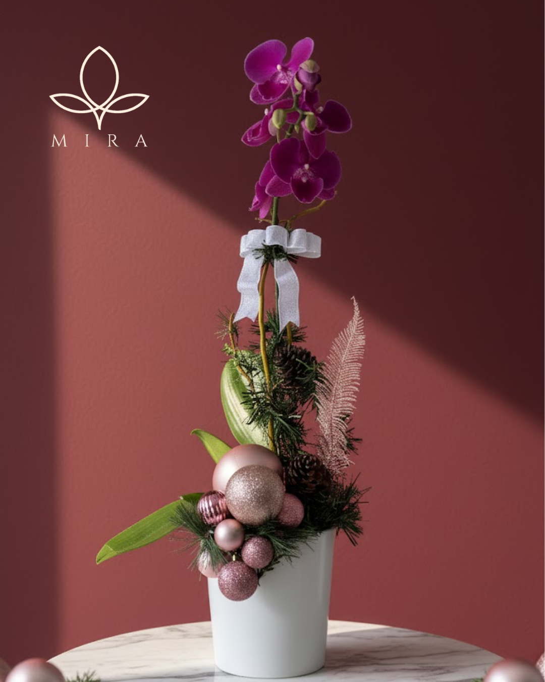 Graceful and festive, this orchid arrangement brings holiday sparkle with shimmering ornaments and natural evergreens.